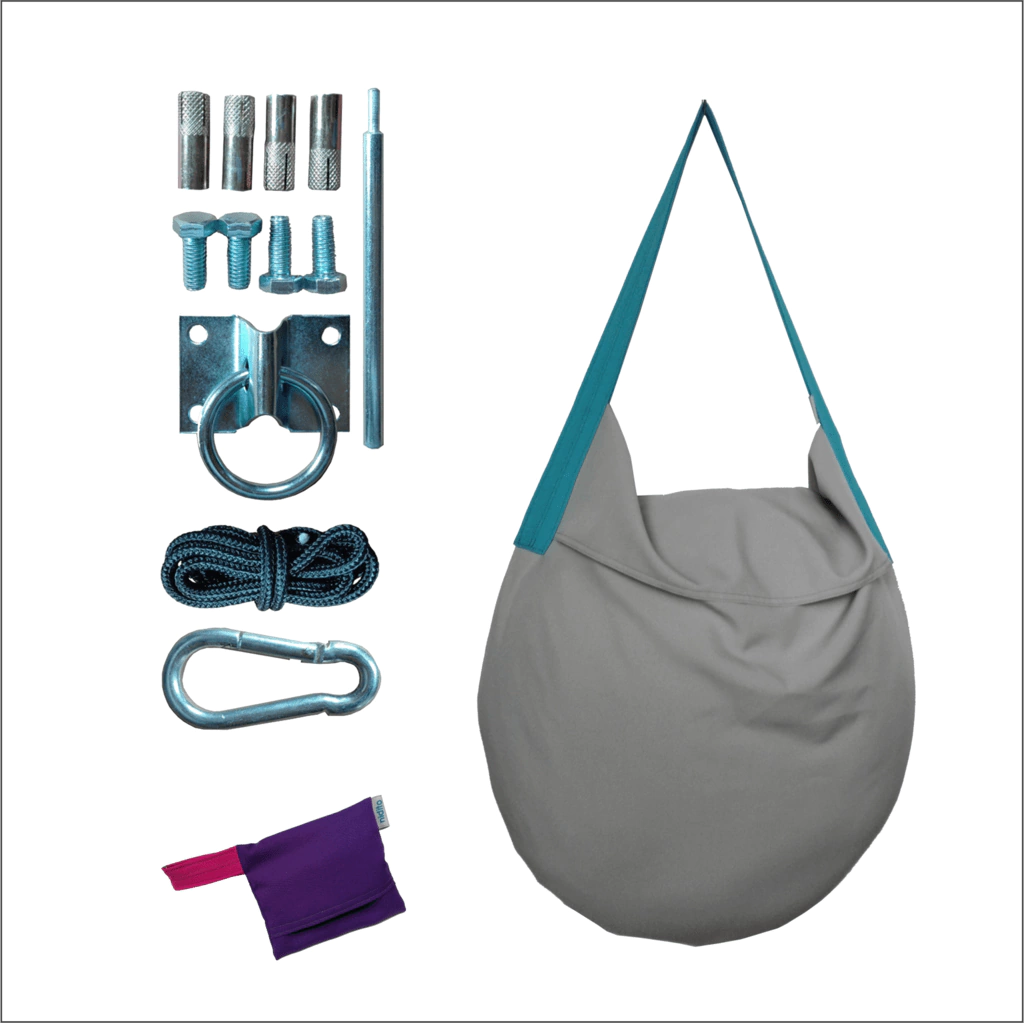 El niditoXL viene en un bolso con la hamaca y su almohadón. Dentro del asiento se encuentra un bolsito con el kit de instalación para colocar el nidito en una losa, viga o árbol con:
